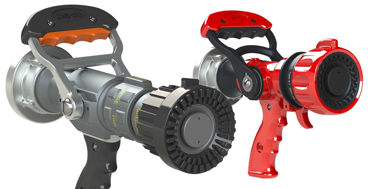 We also have a range of pressure-regulated sliding nozzles from 400 to 1,000L/min. They can be equipped with a full stream and purge position locking trigger, allowing them to be used as DHT nozzles (High Voltage). This range of automatic nozzles can also be equipped with different heads (molded teeth, cut teeth or turbine).